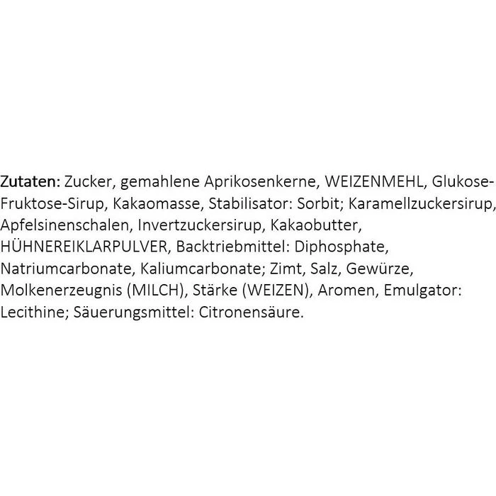 Zutaten: Zucker, gemahlene Aprikosenkerne, WEIZENMEHL, Glukose-Fruktose-Sirup, Kakaomasse, Stabilisator: Sorbit; Karamellzuckersirup, Apfelsinenschalen, Invertzuckersirup, Kakaobutter, HÜHNEREIKLARPULVER, Backtriebmittel: Diphosphate, Natriumcarbonate, Kaliumcarbonate; Zimt, Salz, Gewürze, Molkenerzeugnis (MILCH), Stärke (WEIZEN), Aromen, Emulgator: Lecithine; Säuerungsmittel: Citronensäure.