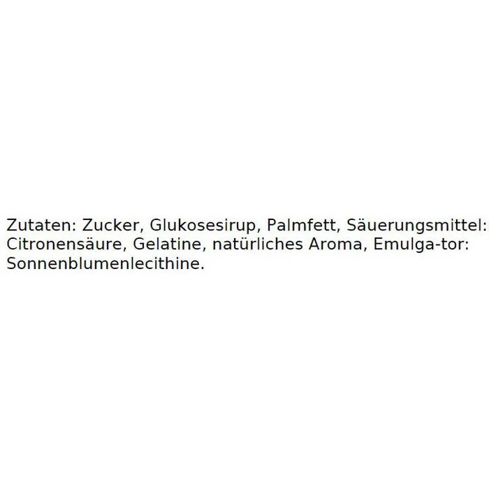 Zutaten: Zucker, Glukosesirup, Palmfett, Säuerungsmittel: Citronensäure, Gelatine, natürliches Aroma, Emulgator: Sonnenblumenlecithine.