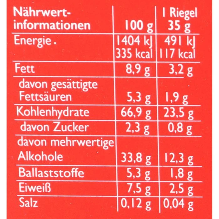 Zutaten: VOLLKORNHAFERFLOCKEN 53%, Süßungsmittel Maltitsirup, Kokosfett, Erdbeersaftkonzentrat 5%, natürliches Aroma, Emulgator Lecithine, Salz.