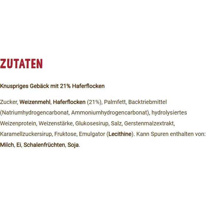 WEIZENMEHL (57%), Zucker, pflanzliche Fette (Palm, Sonnenblume, Kokos in veränderlichen Gewichtsanteilen), HAFERFLOCKEN (13,5%), Backtriebmittel (Ammoniumhydrogencarbonat, Natriumhydrogencarbonat), Salz, Zuckersirup, Säuerungsmittel (Citronensäure), Karamellzuckersirup, Aroma, MAGERMILCHPULVER, MOLKENERZEUGNIS