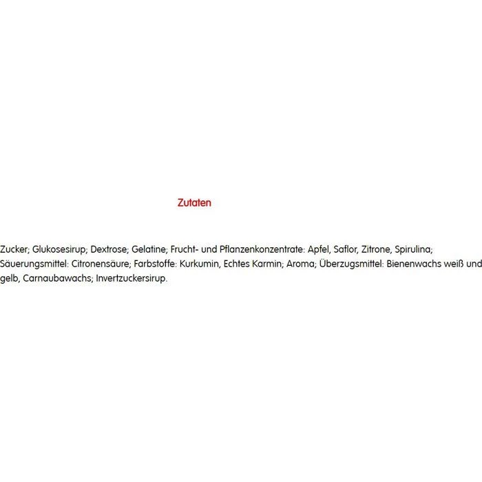 Zutaten: Zucker, Glukosesirup, Dextrose, Gelatine, Frucht- und Pflanzenkonzentrate: Apfel, Saflor, Zitrone, Spirulina, Säuerungsmittel: Citronensäure, Farbstoffe: Kurkumin, Echtes Karmin, Aroma, Überzugsmittel: Bienenwachs weiß und gelb, Carnaubawachs, Invertzuckersirup