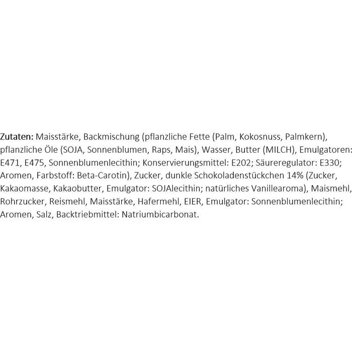 Zutaten: Maisstärke, Backmischung (pflanzliche Fette (Palm, Kokosnuss, Palmkern), pflanzliche Öle (SOJA, Sonnenblumen, Raps, Mais), Wasser, Butter (MILCH), Emulgatoren: E471, E475, Sonnenblumenlecithin; Konservierungsmittel: E202; Säureregulator: E330; Aromen, Farbstoff: Beta-Carotin), Zucker, dunkle Schokoladenstückchen 14% (Zucker, Kakaomasse, Kakaobutter, Emulgator: SOJAlecithin; natürliches Vanillearoma), Maismehl, Rohrzucker, Reismehl, Maisstärke, Hafermehl, EIER, Emulgator: Sonnenblumenlecithin; Aromen, Salz, Backtriebmittel: Natriumbicarbonat.