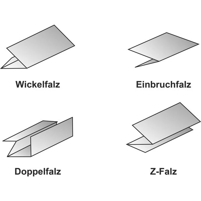 Falzarten: Wickelfalz, Einbruchfalz, Z-Falz, Doppelfalz, alle Falzarten nachstellbar