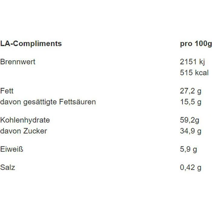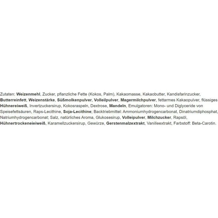 Zutaten: WEIZENMEHL, Zucker, pflanzliche Fette (Palm, Kokos), Kakaomasse, Kakaobutter, Farinzucker, BUTTERREINFETT, VOLLMILCHPULVER, SÜßMOLKENPULVER, MAGERMILCHPULVER, WEIZENSTÄRKE, fettarmes Kakaopulver, flüssiges HÜHNEREIEIWEIß, Invertzuckersirup, Dextrose, MANDELN, Emulgatoren: Lecithine (SOJA), Mono- und Diglyceride von Speisefettsäuren; Kokosraspeln, Glukosesirup, Glukose-Fruktose-Sirup, MILCHZUCKER, Salz, Backtriebmittel: Natriumcarbonate, Diphosphate, Ammoniumcarbonate; natürliches Aroma, VOLLEIPULVER, Rapsöl, MILCHEIWEIß, HÜHNERTROCKENEIEIWEIß, flüssiges HÜHNEREIEIGELB, Karamellzuckersirup, Gewürze, GERSTENMALTEXTRAKT, Vanilleextrakt, Farbstoff: Beta-Carotin, Ammoniumsulfit-Zuckerkulör.