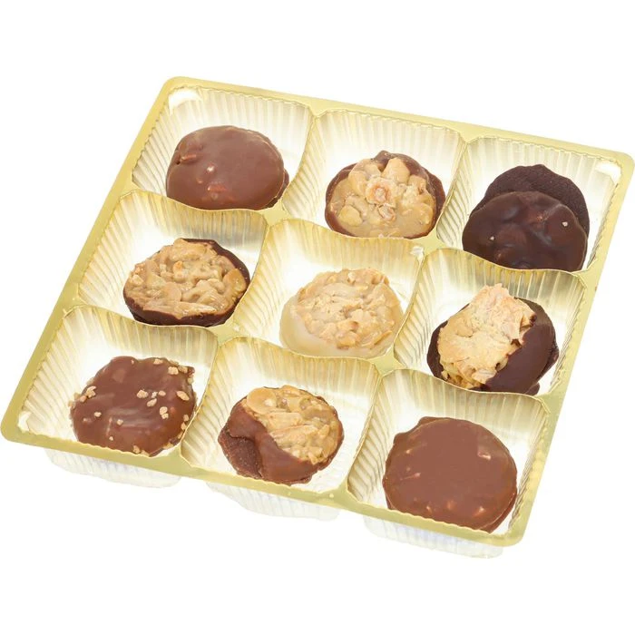 Zutaten: Zucker, 23% MANDELN, Glukosesirup, Palmfett, 6% HASELNÜSSE, Kakaomasse, Kakaobutter, MAGERMILCHPULVER, SÜßMOLKENPULVER, VOLLMILCHPULVER, BUTTERREINFETT, Emulgator: Lecithine (enthält SOJA); natürliches Aroma.