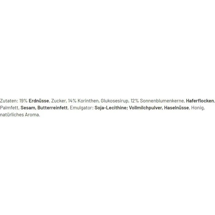 Zutaten: 19% ERDNÜSSE, Zucker, 14% Korinthen, Glukosesirup, 12% Sonnenblumenkerne, HAFERFLOCKEN, Palmfett, SESAM, BUTTERREINFETT, Emulgator: SOJA-LECITHINE; VOLLMILCHPULVER, HASELNÜSSE, Honig, natürliches Aroma.