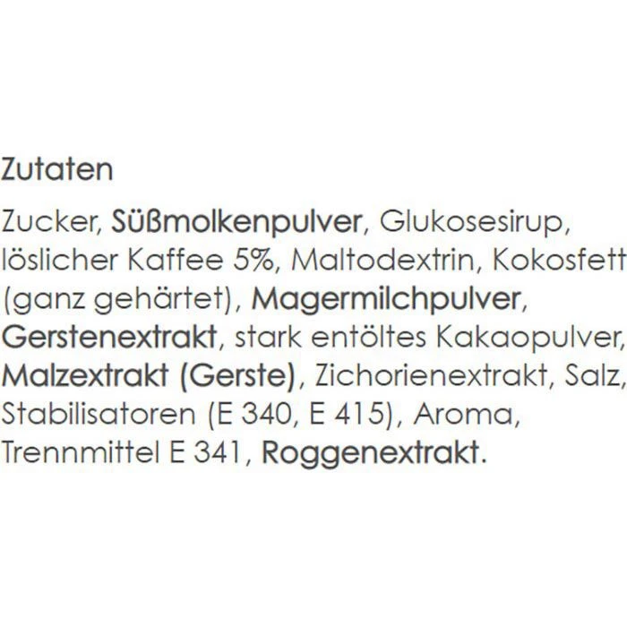 Zutaten: Zucker, SÜSSMOLKENPULVER, Glukosesirup, löslicher Kaffee 5%, Maltodextrin, Kokosfett (ganz gehärtet), MAGERMILCHPULVER, GERSTENEXTRAKT, stark entöltes Kakaopulver, MALZEXTRAKT (GERSTE), Zichorienextrakt, Salz, Stabilisatoren (E 340, E 415), Aroma, Trennmittel E 341, ROGGENEXTRAKT.