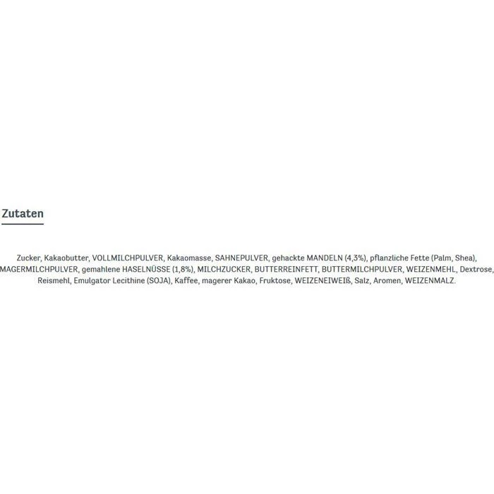 Zutaten: Zucker, Kakaobutter, VOLLMILCHPULVER, Kakaomasse, SAHNEPULVER, gehackte MANDELN (3,7%), pflanzliche Fette (Palm, Shea), MAGERMILCHPULVER, gemahlene HASELNÜSSE (1,9%), MILCHZUCKER, BUTTERMILCHPULVER, BUTTERREINFETT, WEIZENMEHL, Dextrose, Reismehl, Emulgator Lecithine (SOJA), Kaffee, magerer Kakao, Fruktose, WEIZENEIWEIß, Salz, Aromen, WEIZENMALZ
