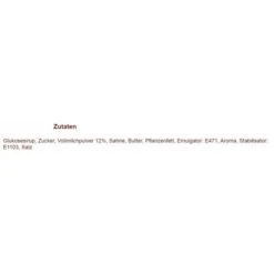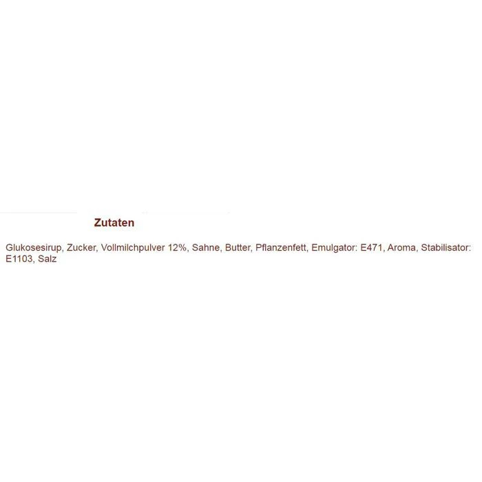 Zutaten: Glukosesirup, Zucker, VOLLMILCHPULVER 12%, SAHNE, BUTTER, Pflanzenfett, Emulgator: E471, Aroma, Stabilisator: E1103, Salz