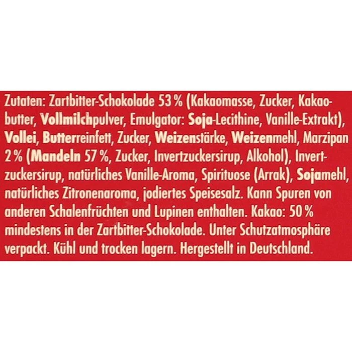 Zutaten: Zartbitter-Schokolade 53% (Kakaomasse, Zucker, Kakaobutter, VOLLMILCHPULVER, Emulgator: SOJALECITHINE, Vanille-Extrakt), VOLLEI, BUTTERREINFETT, Zucker, WEIZENSTÄRKE, WEIZENMEHL, Marzipan 2,0% (MANDELN 57%, Zucker, Invertzuckersirup, Alkohol), Invertzuckersirup, SOJAMEHL, natürliches Vanille-Aroma, Spirituose (Arrak), jodiertes Speisesalz, Natürliches Zitronen-Aroma.