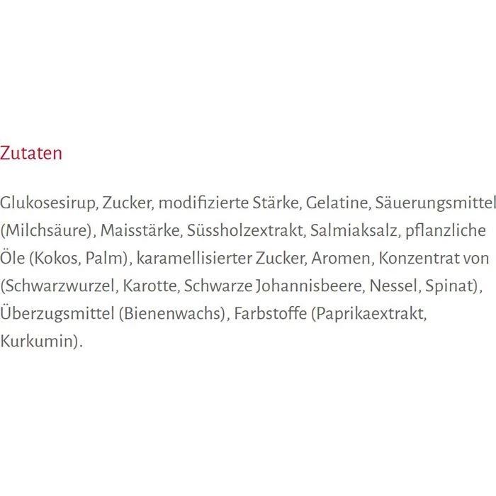 Glukosesirup, Zucker, modifizierte Stärke, Gelatine, Säuerungsmittel (Milchsäure), Maisstärke, Süßholzextrakt, Aromen, pflanzliche Öle (Kokos, Palm), karamellisierter Zucker, Konzentrat von (Schwarzwurzel, Schwarze Johannisbeere, Karotte, Spinat, Nessel), Überzugsmittel (Bienenwachs), Farbstoffe (Paprikaextrakt, Kurkumin), Salmiaksalz