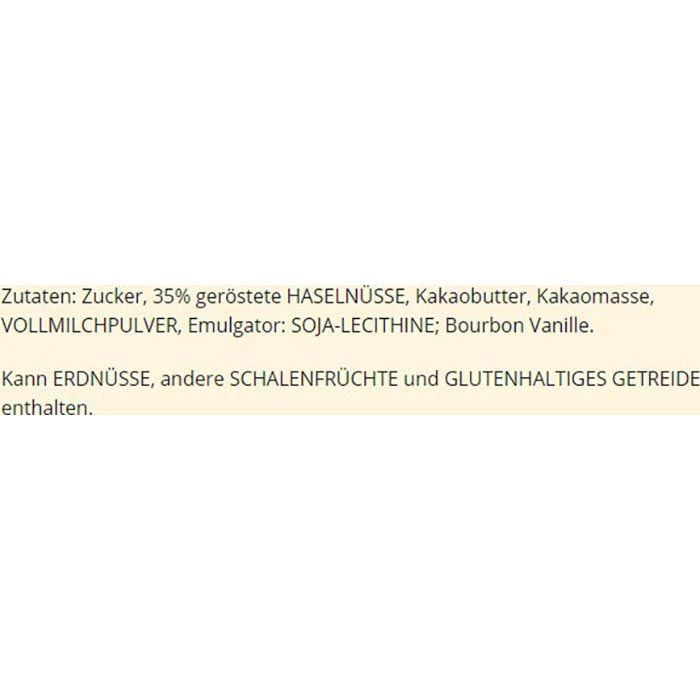 Zutaten: Zucker, 35% geröstete HASELNÜSSE, Kakaobutter, Kakaomasse, VOLLMILCHPULVER, Emulgator: SOJALECITHINE; Bourbon Vanille